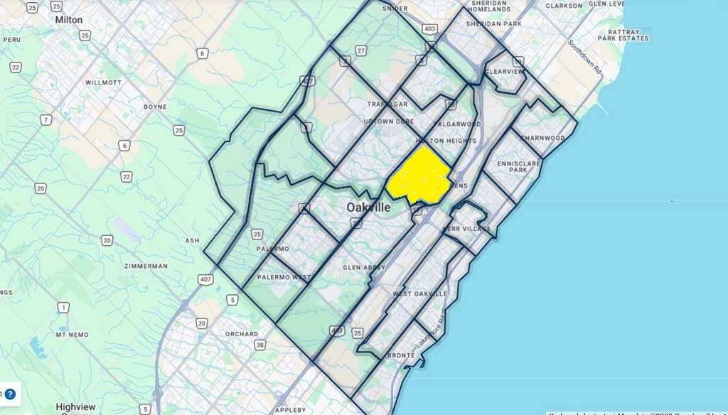College Park社区(TRREB分区编号0080)位于奥克维尔中部,北起Upper Middle Rd East,南至QEW高速,东起Trafalgar Rd, 西至十六里溪Sixteen Mile Creek为界,夹在Glen Abbey和Falgarwood社区之间。该社区的家庭平均年收入为$95,045,房屋类型以房龄较长的独立屋为主,约80%的房屋房龄在30-65年间,价格区间跨度较大。